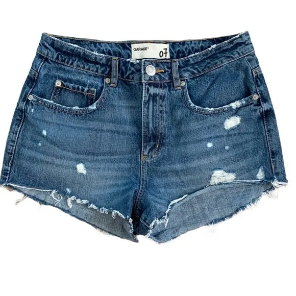 Garage Women’s Festival Distressed Denim Raw Cut Hem Jean Shorts Size 7 Five pocket styling Button... Show more