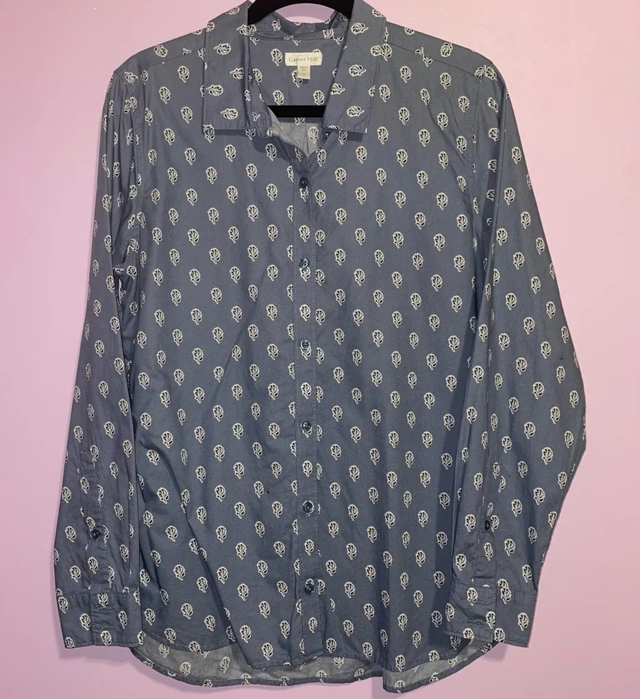 Elegant blue shirt with white floral accents. Ideal for versatile styling. Garnet Hill Button Up To... Show more