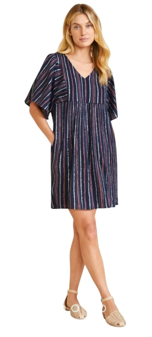 Capture effortless charm with this brand new, with tags Garnet Hill Lola Shimmering dress, a delightful blend of comfort and style. The rich navy backdrop is adorned with vertical stripes in soft burgundy and shimmering silver, creating a visually engaging pattern that flatters the silhouette. Flutter sleeves add a touch of airy grace, while the V-neckline offers a flattering and feminine touch. This dress is made of organic cotton. The NWT Garmet Hill Lola Shimmering dress will ship quickly from a smoke free home. Keywords: Garnet Hill dress, striped dress, v neck, flutter sleeve, casual wear, boho, relaxed fit, lightweight, summer dress, vacation, shimmer, metallic stripe, everyday