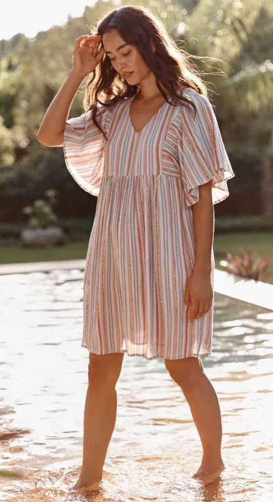 ✨Garnet Hill Lola Shimmering Organic-Cotton Dress Requisite for the season, our popover dress is cast in gauzy organic cotton for romantic charm, with metallic shimmer for edgy flair, seams for shaping, and pockets for fun. Size: Medium Relaxed fit V-neckline Short, wide flutter sleeves; unlined Allover metallic stripes that change direction on the sleeves Bodice seaming On-seam pockets Above-knee length Organic cotton/other Cotton voile lining Imported Material: Shell: 97% Organic Cotton 3% Other Fibre Lining: 100% Cotton Retails: $139 BIN 44✨