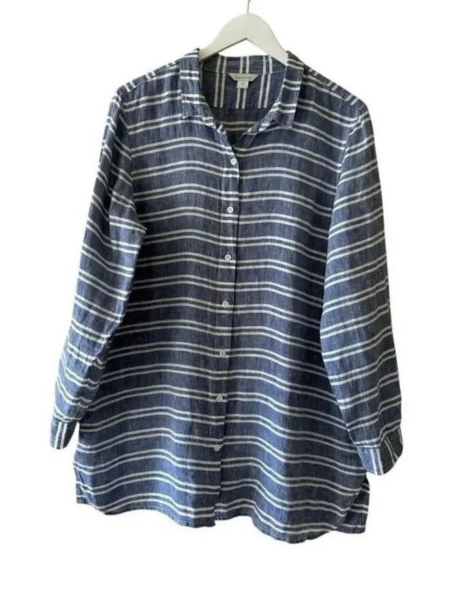 Garnet Hill linen blue nautical white striped lagenlook breathable classic button up top SZ L#2327 E... Show more