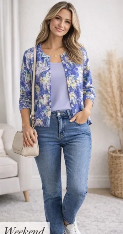 Garnet Hill Painterly floral 100% Merino Wool Work to Weekend Cardigan Size Small Purple - $36 - From Jaime