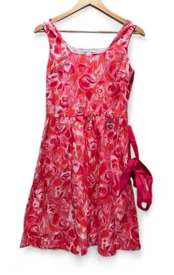 garnet hill pink floral rose sleeveless sun dress sz 6 100% cotton. lined. belted. great, pre owned... Show more