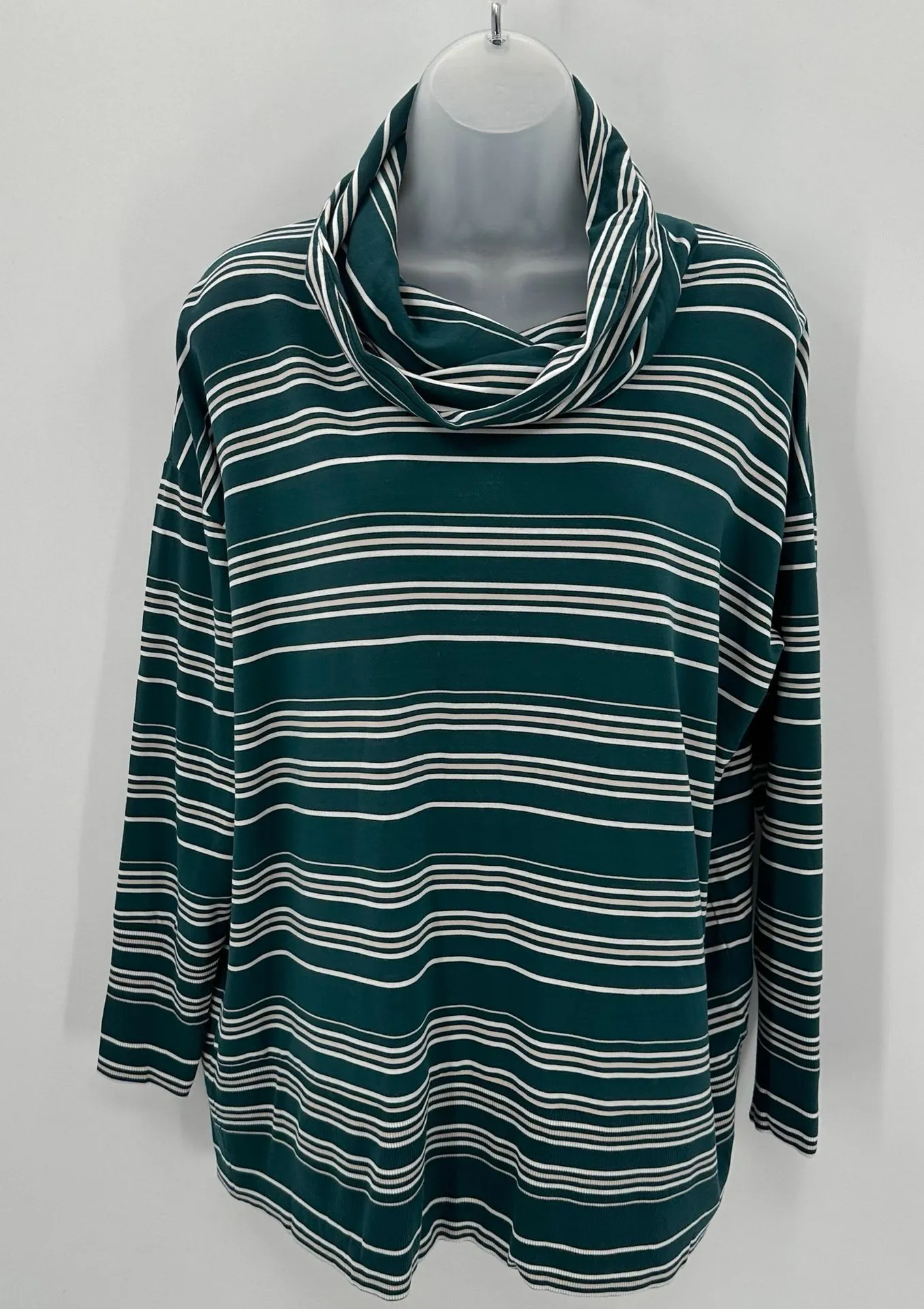 Garnet Hill Top Tunic Women’s M Teal Stripe Cowl Turtleneck L/S Tencel Knit Cowl neck long sleeve top has drop shoulders and slightly oversized/longer or tunic length fit. Soft rib knit has ribbed hem and ends of sleeves. Dark teal/blue-green background with white and beige contrasting stripes. Tag size M Womens. Tencel/spandex knit. Garment has been cleaned according to manufacturer instructions. See photos for details and approximate flat lay measurements to determine fit. Good preowned condition