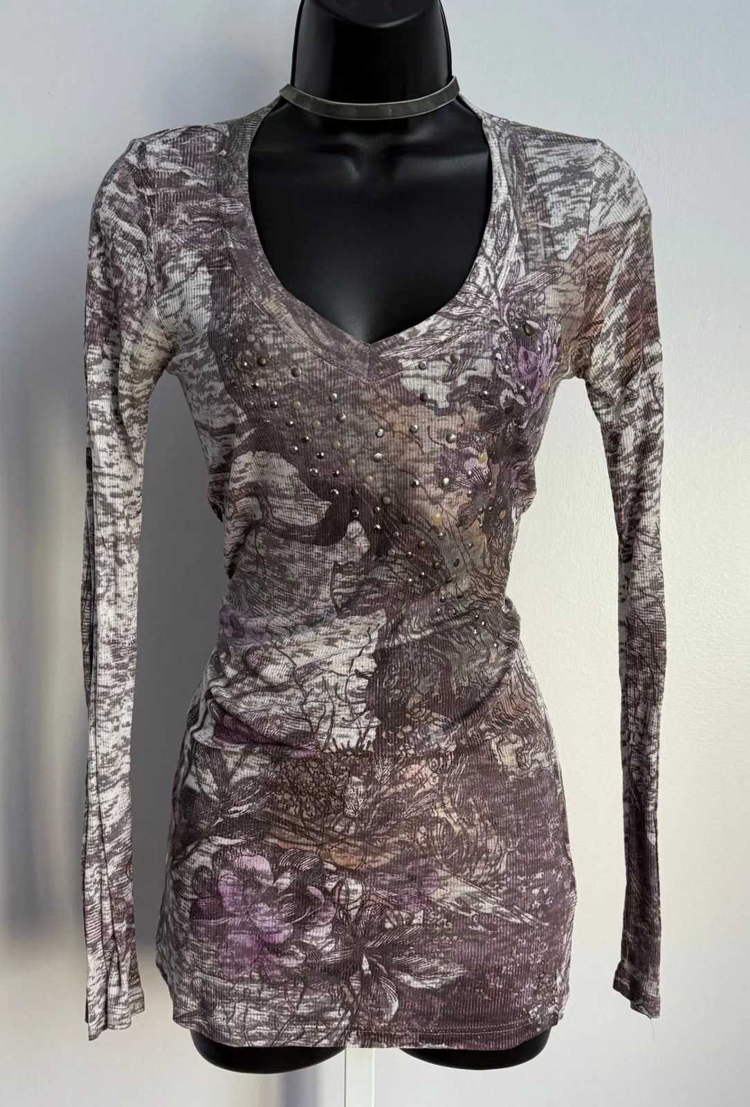 Vintage Gavriel LA Y2K Bling Baby Tee Floral Rhinestone Long Sleeve Top T Shirt Medium Gently used with no flaws. Unique long-sleeve top, showcasing an intriguing floral and tree branch design. This top is embellished with delicate rhinestones that add a touch of subtle sparkle, perfect for elevating any casual look. Its V-neckline offers a flattering silhouette, while the ribbed texture throughout provides a comfortable, stretchy fit. A distinctive piece that combines nature-inspired aesthetics with a hint of glamor. Keywords: Gavriel, floral top, rhinestone top, long sleeve top, womens top, medium, v neck, bohemian, casual top, unique design, textured top, purple, brown, fitted Measurements: Pit to pit: 16" Length: 28" Weight: 5 oz SKU: SS20