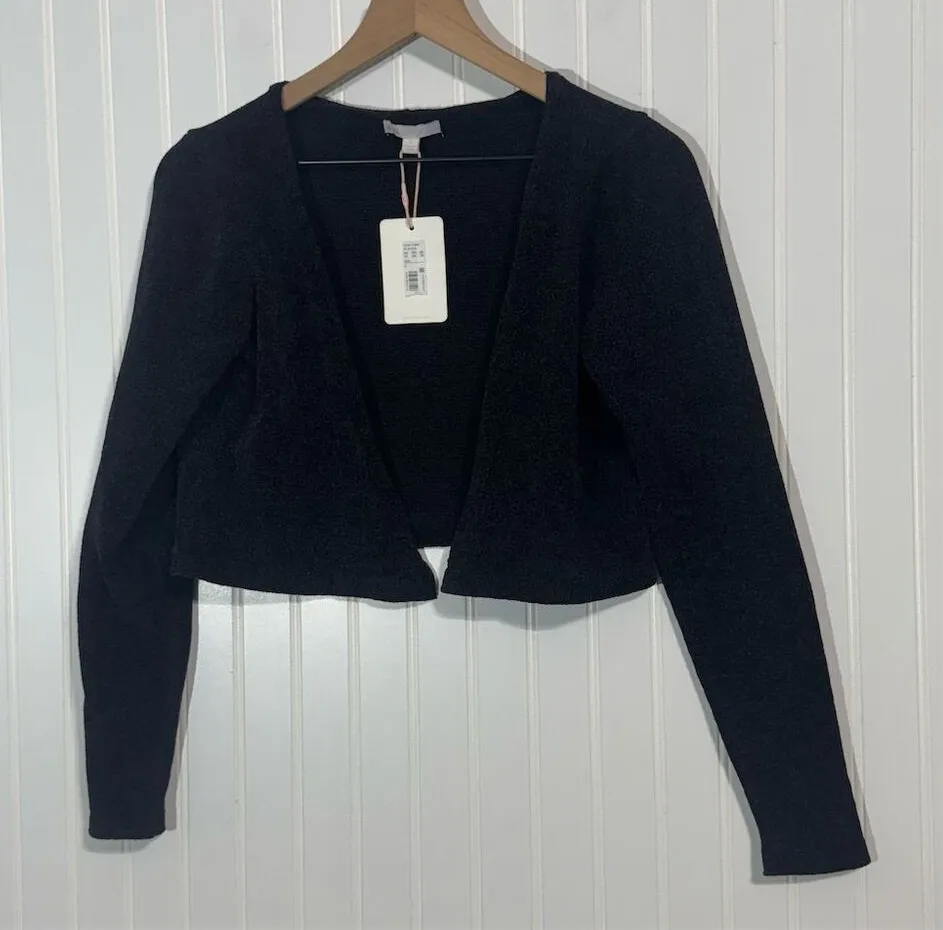 GB Girls, Gianni Bini, black cardigan, cropped sweater, long sleeve, open front, layering piece, minimalist, classic, office wear, casual chic, Dillard’s, new with tags, women’s size small, fall winter staple, soft knit, versatile