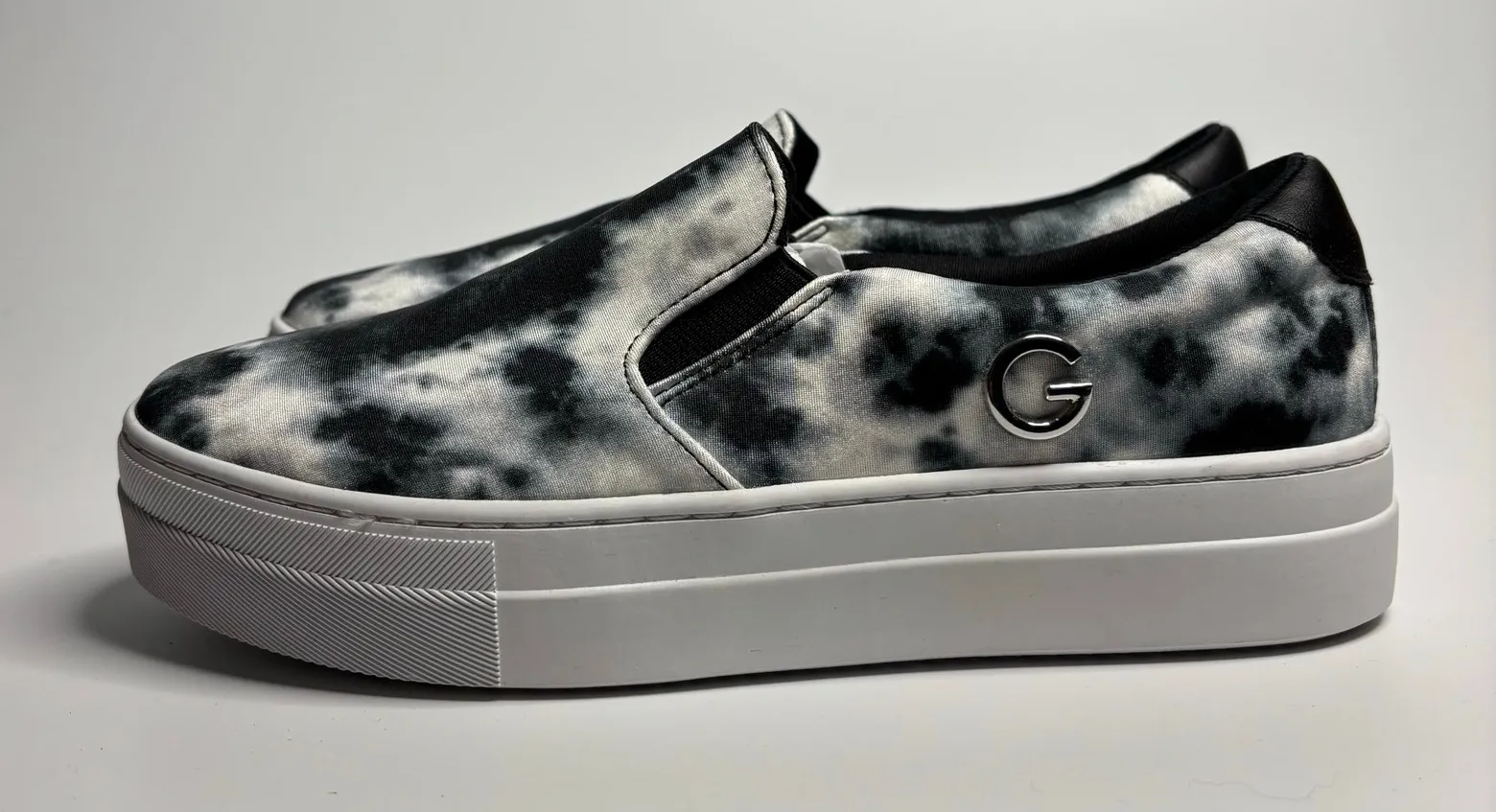 Textile upper with synthetic tie dye pint overlays. Vamp goring for easy on and off. Closed round toe. Breathable textile lining. Lightly cushioned footbed. Durable rubber outsole. US Women’s 7