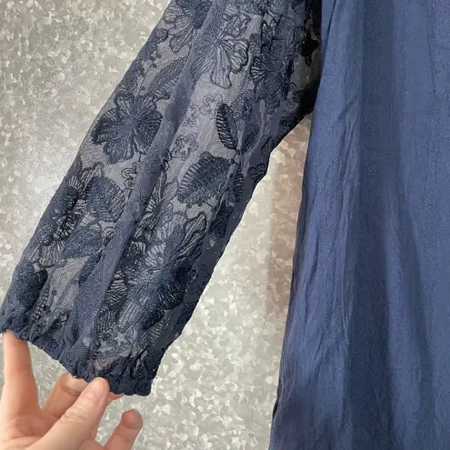 Women's plus size boho cottagecore top by Lane Bryant. This dark blue blouse has long sheer embroid... Show more