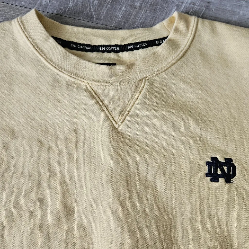 NCAA Notre Dame GoIrish College Alumni Academia Coastal Grandma This sweatshirt offers a soft cotton blend, a relaxed fit, and a stylish Notre Dame logo embroidery, making it suitable for casual days. • Crewneck design for comfort • Ribbed cuffs and hem • Embroidered Notre Dame logo • Machine washable • Yellow color with relaxed fit Top to bottom = 24 inches Pit to pit = 23 inches Sleeve: 23 inches Pre-owned, good - quality feel Make sure to follow us for more to come.