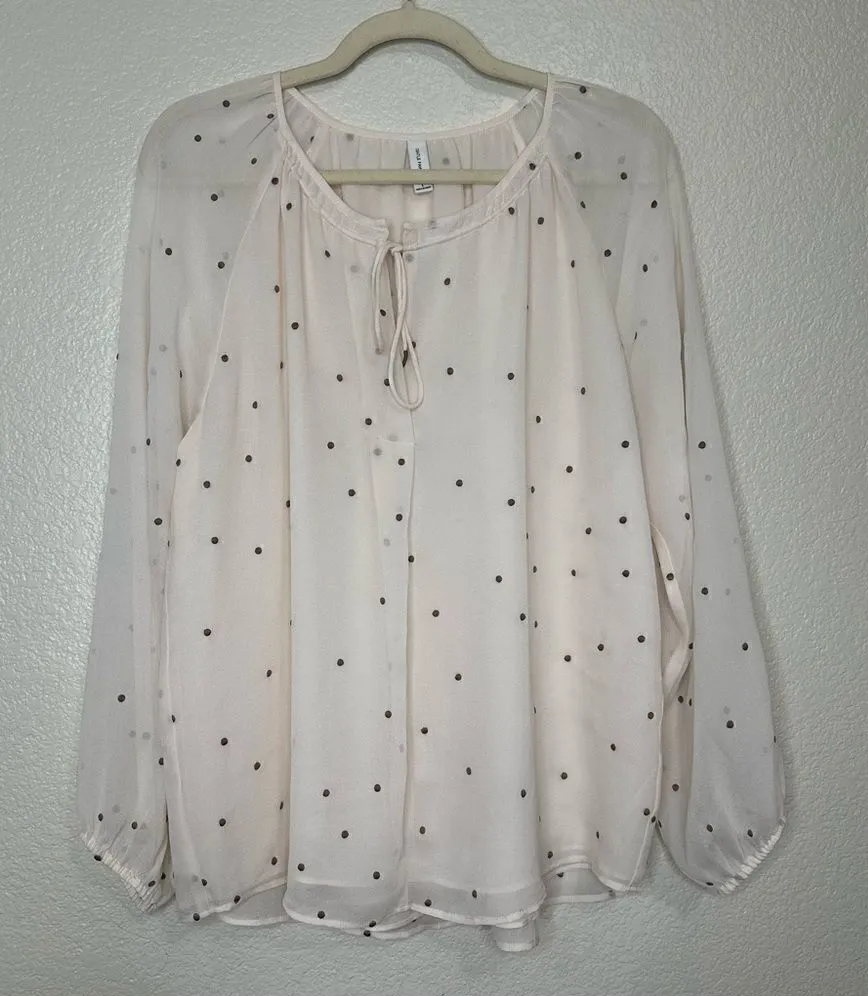 Size: Large Color: Cream - Tie neckline - Long Sleeves with elasticized cuffs - Sheer Sleeves and Lined Blouse - Polka Dot Embroidered all over - Lightweight material - 100% Polyester - Hand Wash Cold - Imported Gentle Used Excellent Pre-owned Condition Pet/Smoke free home Measurements Approx: Pit to pit: 22" Length: 26.5" Sleeves Approx: 23" Tags: boho summer beach vacation casual formal contemporary feminine