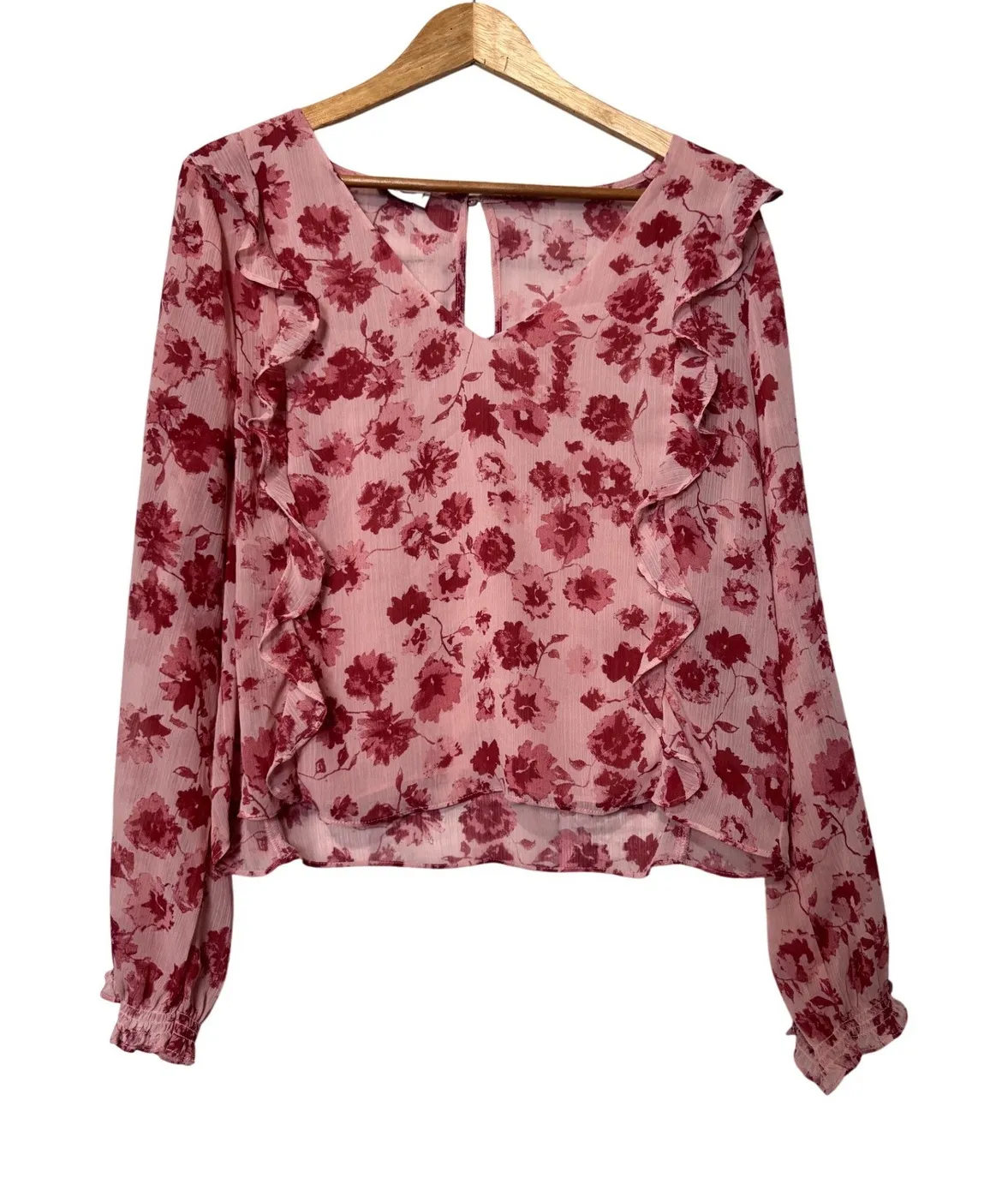Gentle Fawn pink long sleeve blouse with a delicate allover floral print. This charming top features ruffled detailing along the neckline and down the front, a flattering V-neck with a keyhole detail at the back, and elasticized cuffs. The sheer chiffon fabric and flowy silhouette create an effortlessly feminine look, perfect for brunch with friends or a casual day out. Measurements: • Bust: 20 in • Length: 23 in • Sleeve Length: 24 in Type: Blouse Department: Women Style: Cropped Material: Polyester Neckline: Square Neck Sleeve Length: Long Sleeve Sleeve Type: Bell Sleeve Pattern: Floral Accents: Ruffle Theme: Flower Features: Lightweight Fit: Regular Fabric Type: Chiffon Occasion: Casual, Party/Cocktail Closure: Pullover Keywords: sheer, chiffon, ruffles, keyhole, long sleeve, floral print, feminine, lightweight, boho, casual, daytime, brunch Reasonable offers will always happily accepted