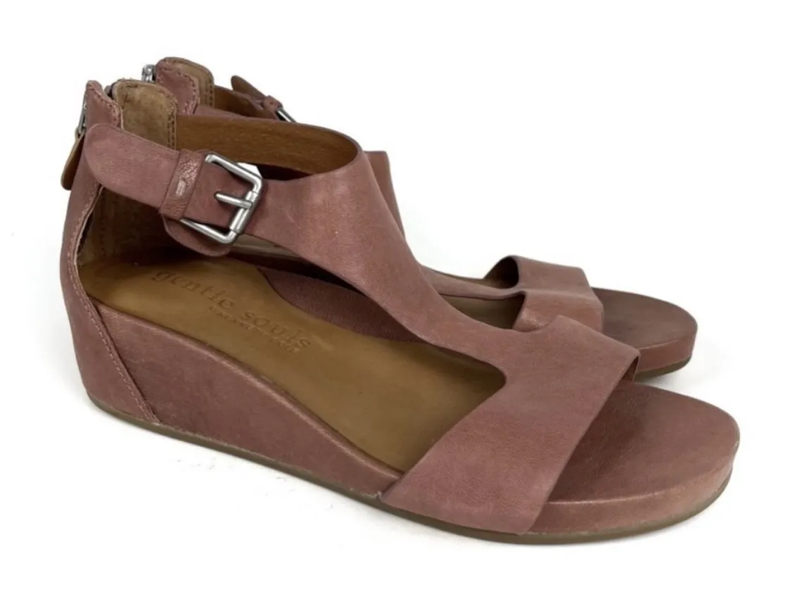 The perfect summer sandal! Light pink mauve color leather top. T-strap style strap across the top of the foot. Zip up in the back. Light scuffing from storage. Overall very good condition. Size 6.5. Heel approx. 1.5in.