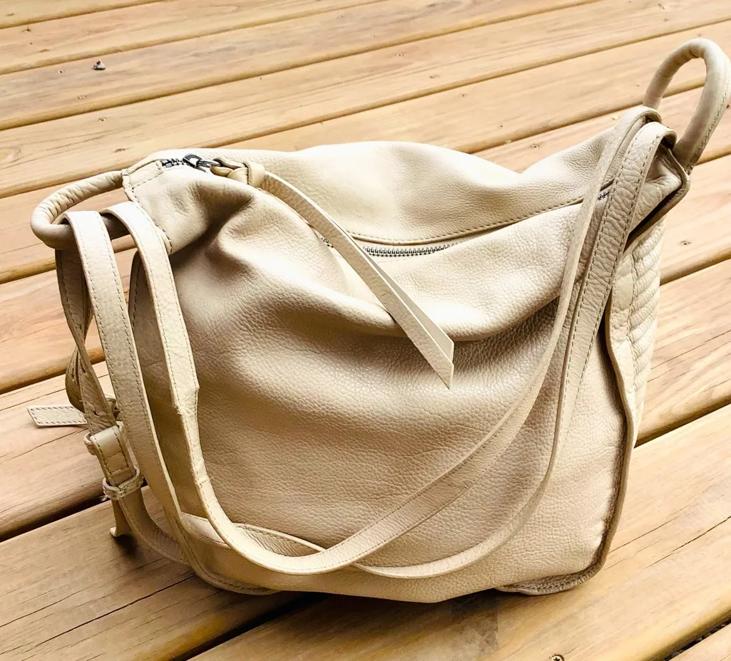 Perfect GENUINE LEATHER bag for summer season. Nice light beige color goes with any outfit. Preowned and overall in great condition. Handles are long enough to wear it on shoulder. They are from two layers and I want to note that one side at seam shows weakness and recommended to reinforce it what easy does cobbler. Price accordingly lower as purses in this brand cost way more.