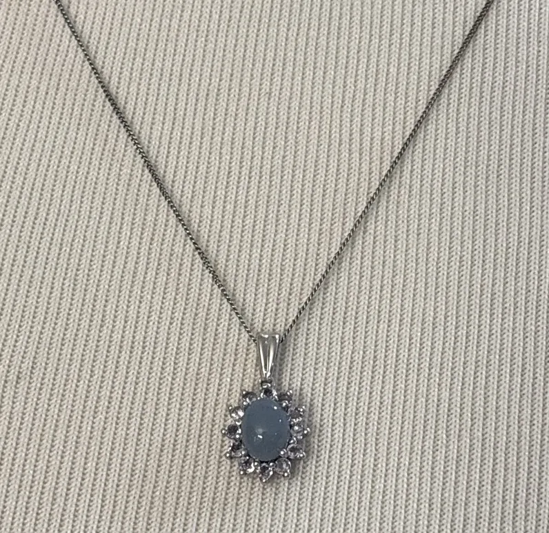 Elegant and timeless, this pendant necklace features a 1.00 ct. genuine Ocean Blue Opal accented by sparkling Tanzanite stones (0.62 ct. total weight). Crafted in solid .925 sterling silver, the piece comes complete with a 20-inch sterling silver chain. Each piece is stamped. 💎 Details: • Main Stone: Genuine Ocean Blue Opal (1.00 ct.) • Accent Stones: Genuine Tanzanite (0.62 ct. total) • Total Gemstone Weight: 1.62 ct. • Metal: .925 Sterling Silver • Chain Length: 20 inches (included) • Pendant Style: Classic halo design • Condition: New / Never Worn