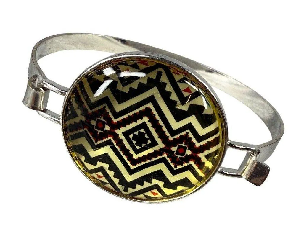 . Unbranded. • Silver-tone band hook closure, see photo • Glass dome with vibrant geometric Aztec pattern • Unique tribal-inspired design • Lightweight and comfortable • Easy to pair with outfits Previously worn condition. May have scratches or scuffs from previous wear and age. Please see photo's You may see reflections of the light setup in photos. Condition: Pre-Owned Good good previously worn condition