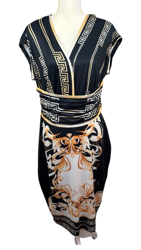 Elevate your wardrobe with this colorful midi dress. Has geometric and Greek key patterns, which adds a touch of luxury to any event. Perfect for the office, vacation or party events. Fabric content: 100% polyester. Garment care: Machine washable. Size: This is a women’s size 0X. Approximate measurements, laying flat: Length: 46 inches Bust: 18 inches
