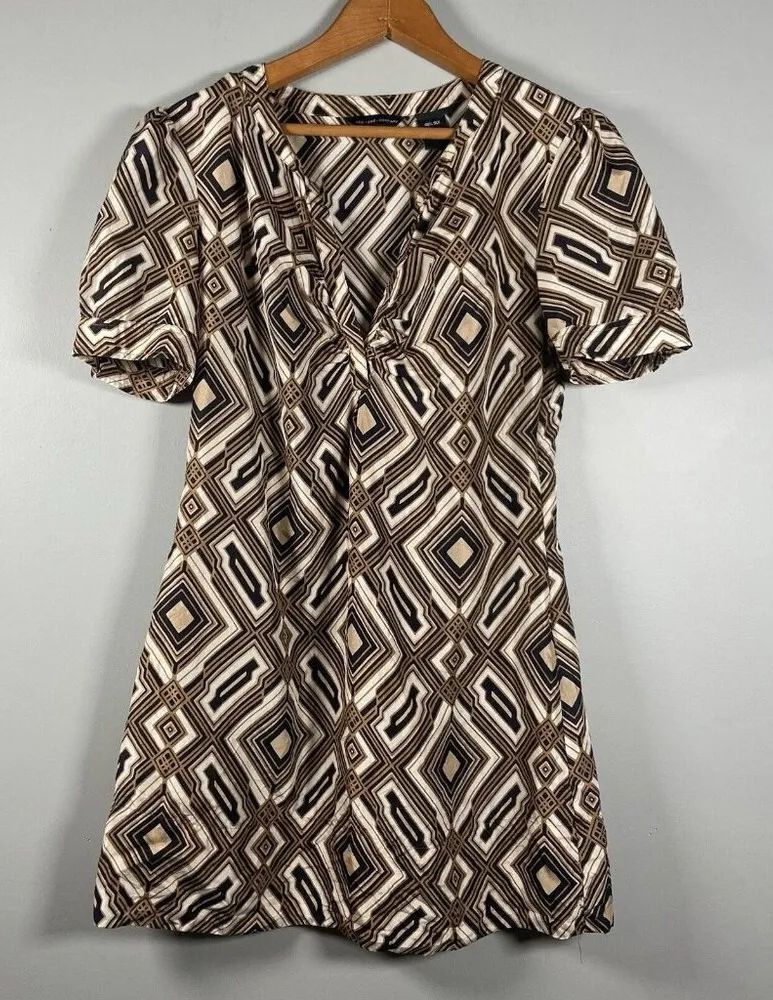 Command attention in this striking geometric print dress. The bold pattern, featuring a dynamic mix of brown, black, and white, creates a visually captivating effect. A flattering V-neckline and short sleeves add a touch of femininity, while the mini length keeps it modern and playful. This dress is perfect for making a statement at a casual brunch, a stylish daytime event, or a fun night out. Keywords: geometric print dress, mini dress, short sleeve dress, v neck dress, brown dress, black dress, white dress, casual dress, party dress, silk dress, womens dress, patterned dress, contemporary dress Thank you so much for your interest in my item! Please check out the other items in my store! Have a great day.
