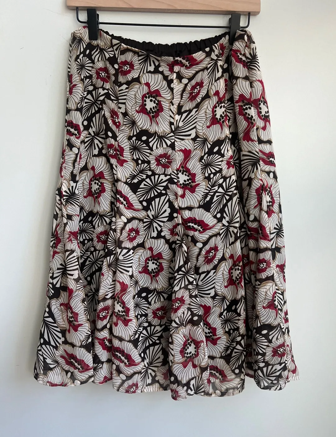 A captivating floral dance awaits in this midi skirt, where elegance meets everyday charm. The skirt features a lively floral pattern of rose peony flowers and swirling geometric shapes creating a mesmerizing effect. The A-line silhouette gracefully flatters, while the comfortable elastic waistband ensures a perfect fit. This skirt is ideal for adding a touch of playful sophistication to a brunch date, a casual day at the office, or an outdoor garden party. Type: Skirt Style: A-Line Skirt Length: Midi Color: Red Department: Women Pattern: Floral Material: Polyester Fabric Type: Chiffon Features: Elastic Waist, Lightweight, All Seasons Character: Bohemian, Floral, Rose, Peony Closure: Pull On Occasion: Casual, Party/Cocktail, Travel Keywords: Floral skirt, Midi skirt, George ME skirt, Flower print skirt, A-line skirt, Size 8 skirt, Women's skirt, Red floral skirt, Black floral skirt, Beige floral skirt, Elastic waist skirt, Boho skirt, Casual skirt, Party skirt, Everyday skirt