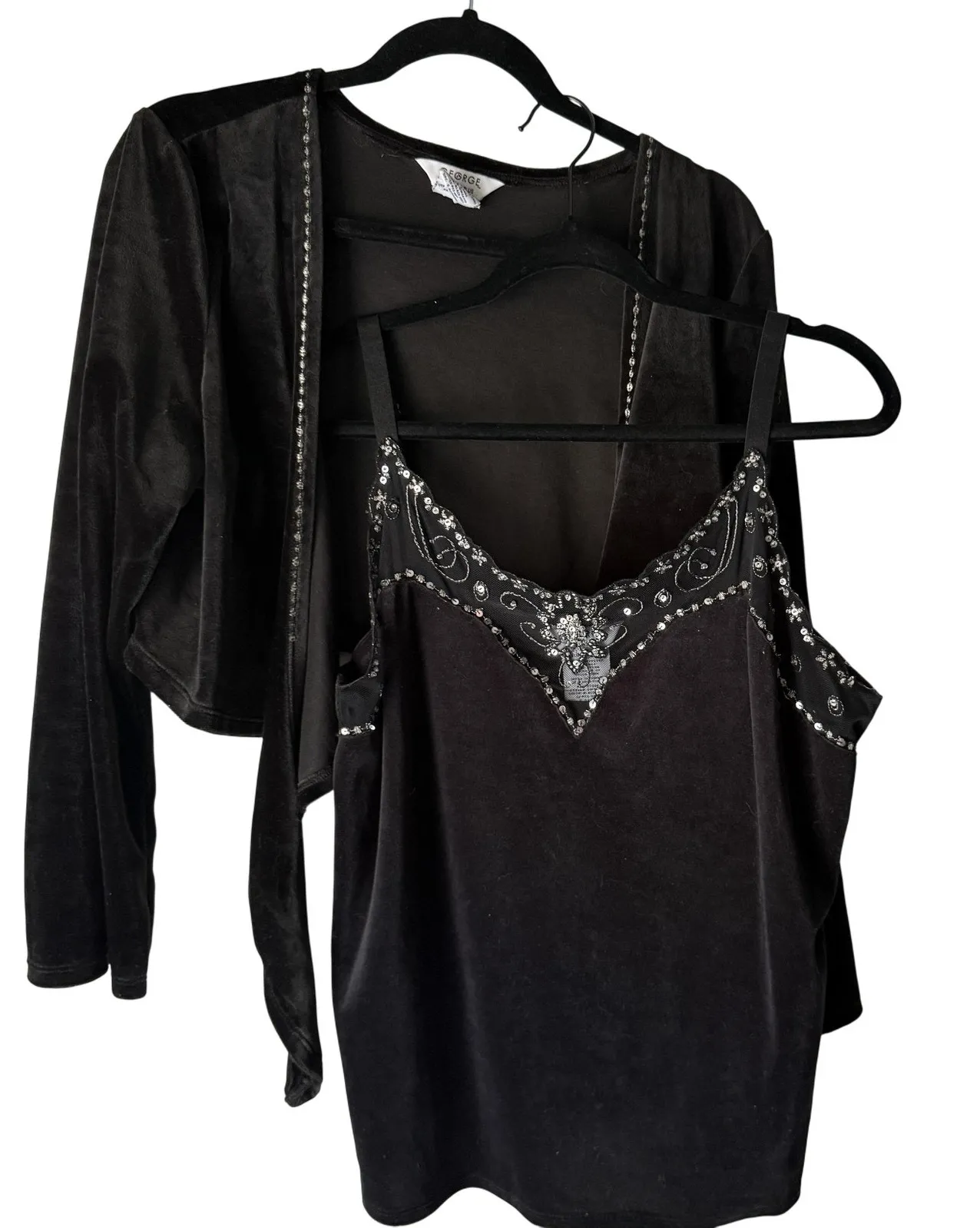 George Tank Top Vintage 90s Set Womens 16W Velvet Mesh Beaded Plus Whimsigoth Condition: Gently worn, no visible flaws or stains noted 2 piece set includes a sleeveless velvet tank top with mesh and beaded detail, and a long sleeve velvet tie-front cardigan with matching sequin/bead trim Material (tank): Body 100% polyester, contrast 100% nylon mesh (exclusive of decoration) Material (cardigan): 100% polyester (exclusive of decoration) Color: Black (label: Black Soot) Tag size: Womens 16W Plus Cardigan is cropped with long sleeves and an open tie front Tank features adjustable straps and intricate sequin and beaded embellishments on mesh neckline Both pieces have matching decorative bead trim for a coordinated look Made in China Style code: GWS41110 Chest (pit to pit, tank): approx 18.5" across (see photos for measurement reference) Perfect for evening, special occasions, party, or cocktail events