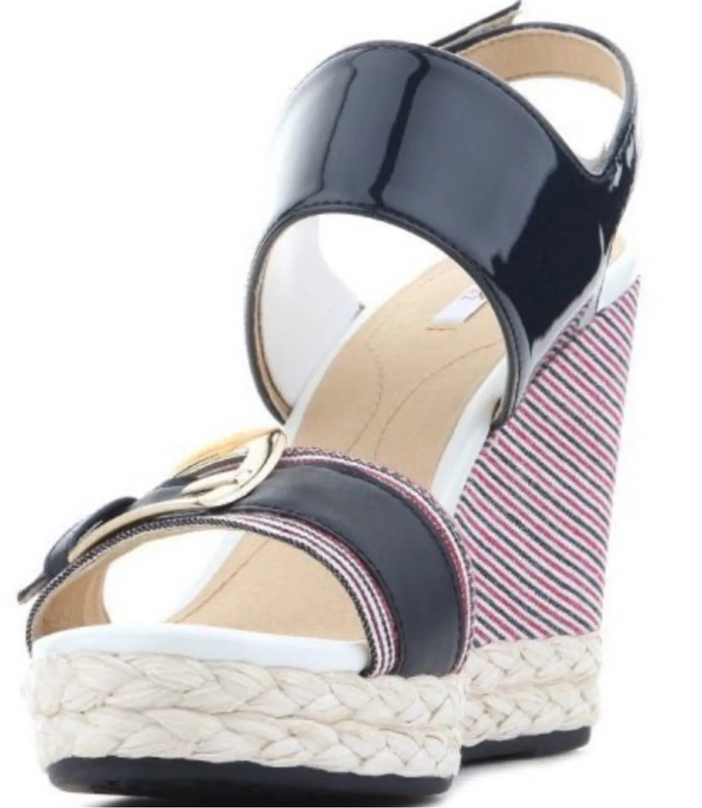 New in box Geox Respira D Janira wedge sandals in women’s size 9, still wrapped in original paper. Sleek black patent upper paired with a bold red, white, and blue striped woven wedge heel for a feminine, preppy, nautical-inspired look. Approximate heel height is 4” with a 1” platform sole for added comfort and stability. Designed with Geox’s signature breathable Respira sole to keep feet cool and comfortable all day. Perfect for summer vacations, holidays, resort wear, and classic warm-weather outfits. A standout yet versatile sandal with comfort-driven design. Geox Respira, Janira wedge, breathable sandals, black patent wedge, nautical sandals, women’s summer shoes, platform wedges, vacation footwear. #Geox #Respira #WedgeSandals #NauticalStyle #PreppyLook #SummerFashion #BreathableShoes #VacationStyle #ClassicStyle #NIB