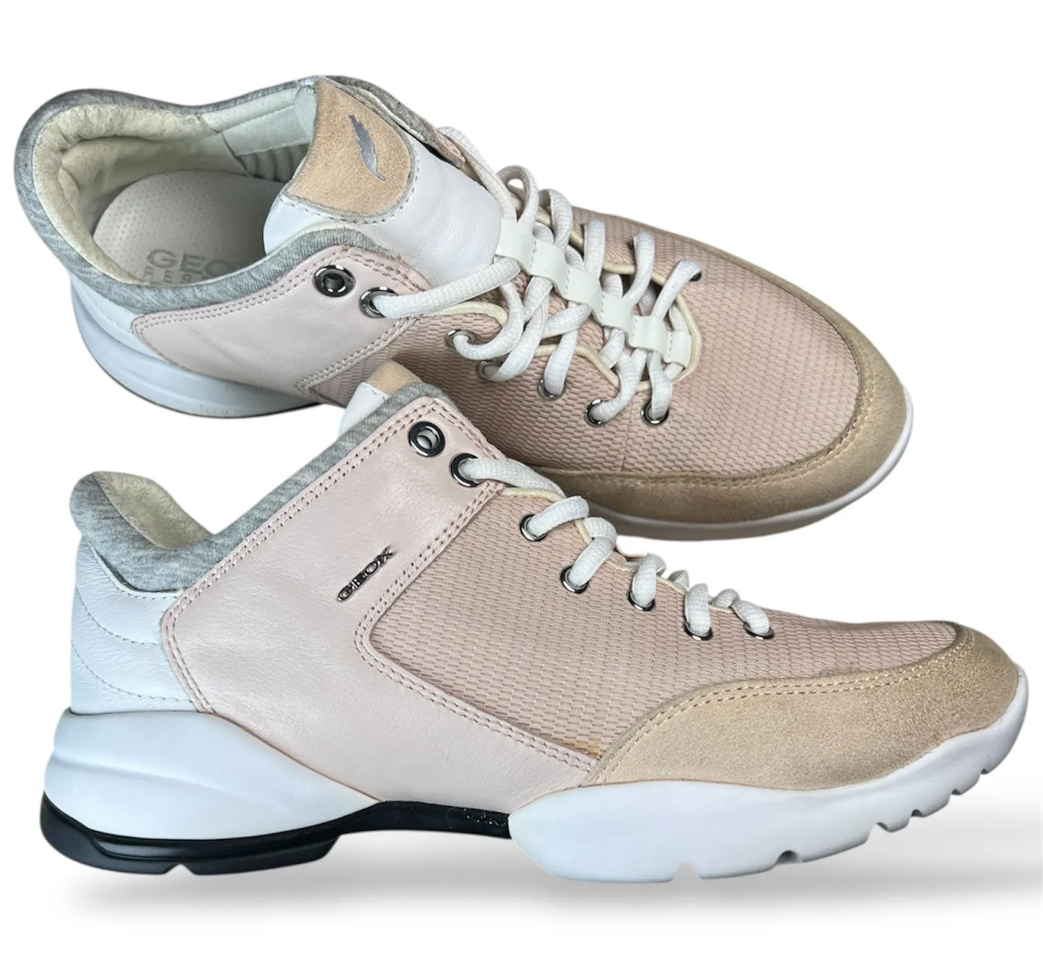 Discover ultimate comfort and style with these GEOX Respira sneakers. These athletic shoes blend a soft pink mesh upper with complementary beige suede and smooth leather accents for a chic and versatile look. Designed with GEOX's signature breathable technology, your feet will stay comfortable and fresh all day Department: Women UK Shoe Size: 4 Upper Material: Mesh Features: Breathable, Comfort, Cushioned, Lightweight, Stretch Shoe Width: Standard EU Shoe Size: 37 Performance/Activity: Gym & Training, Hiking, Walking Accents: Zipper, Logo Style: Sneaker Type: Athletic Shoe Shaft Style: Mid Top Insole Material: Fabric Keywords: Geox sneakers, athletic footwear, pink sneakers, beige sneakers, leather sneakers, suede sneakers, mesh sneakers, comfortable shoes, womens athletic shoes, breathable shoes, casual sneakers, travel shoes, everyday wear