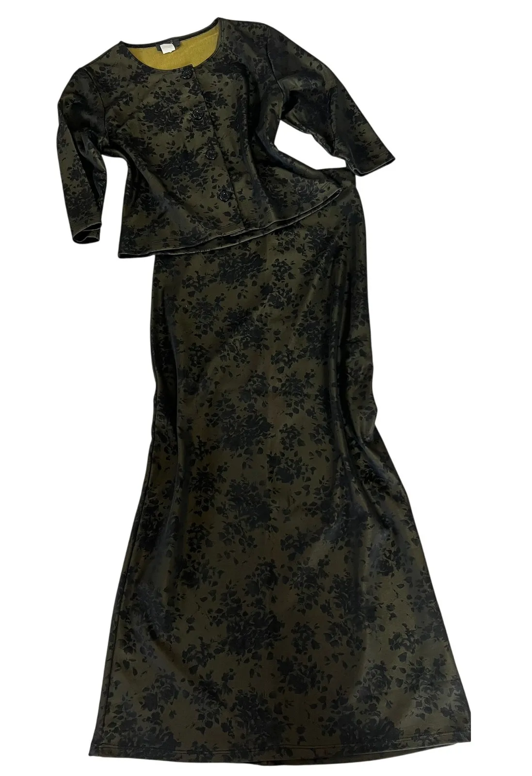 Brand: Geri C. Color: black floral print all over on Dark Green Style: Vintage 90s, Gucci Green style, 2 piece matching jacket and skirt set *Jacket/top is size Large *Skirt is size medium Please review photos for MEASUREMENTS: Made in USA #fairycore#darkfairy#90sfashion #90svintage#darkfloral#whimsi#officeset#brunchset#backtoschool#clueless#rachelgreen#falloutfit#fallmatchingset#vtg90s