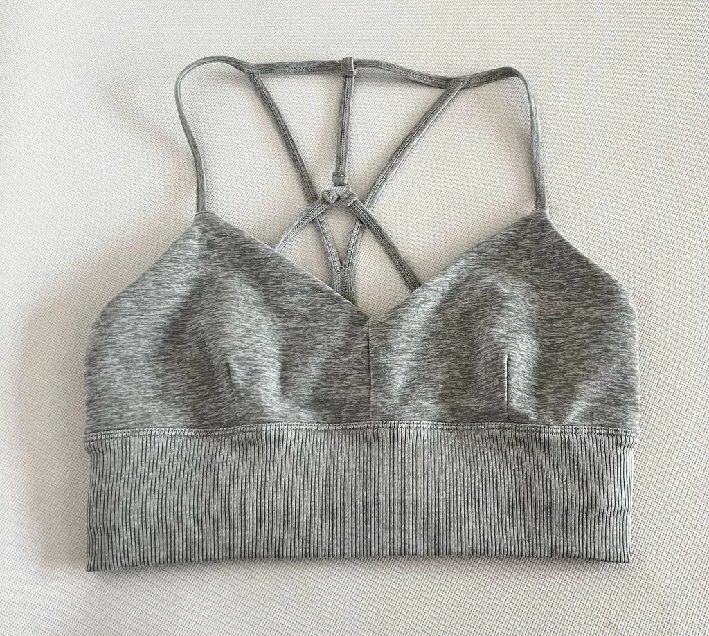 (MISSING PADING) Alo Yoga Alosoft Lush Bra Sz Small Heathered Gray Strappy back Detail Long Line. Fe... Show more
