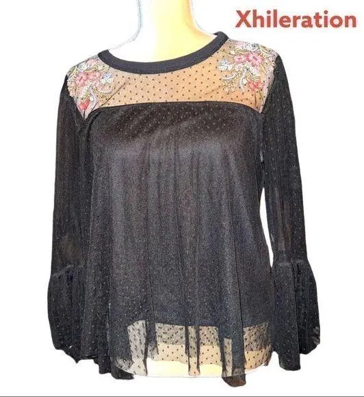 Pretty cool black top lace overlay with floral embroidered design! Cute sheer black lace bell sleeve... Show more