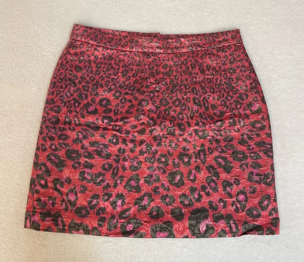 Bold and ultra-fun Giambattista Valli for Impulse mini skirt featuring a striking red + pink metallic leopard print. Structured woven fabric with shimmer detail, fully lined, and perfect for nights out, concerts, parties, and Y2K revival styling. Hidden back zipper. Slight stretch. Size: 10 Flat Measurements: Waist 15 in Hip 20 in Length 19 in Hem 22 in Fabric: Shell – 45% Nylon, 45% Polyester, 10% Metallic Lining – 100% Polyester Keywords: dopamine dressing, Y2K glam, coquette edge, party skirt, metallic shimmer, bold print, animal print, red leopard, statement skirt, holiday outfit, going-out style, trendy mini skirt Condition: Excellent — no flaws noted.