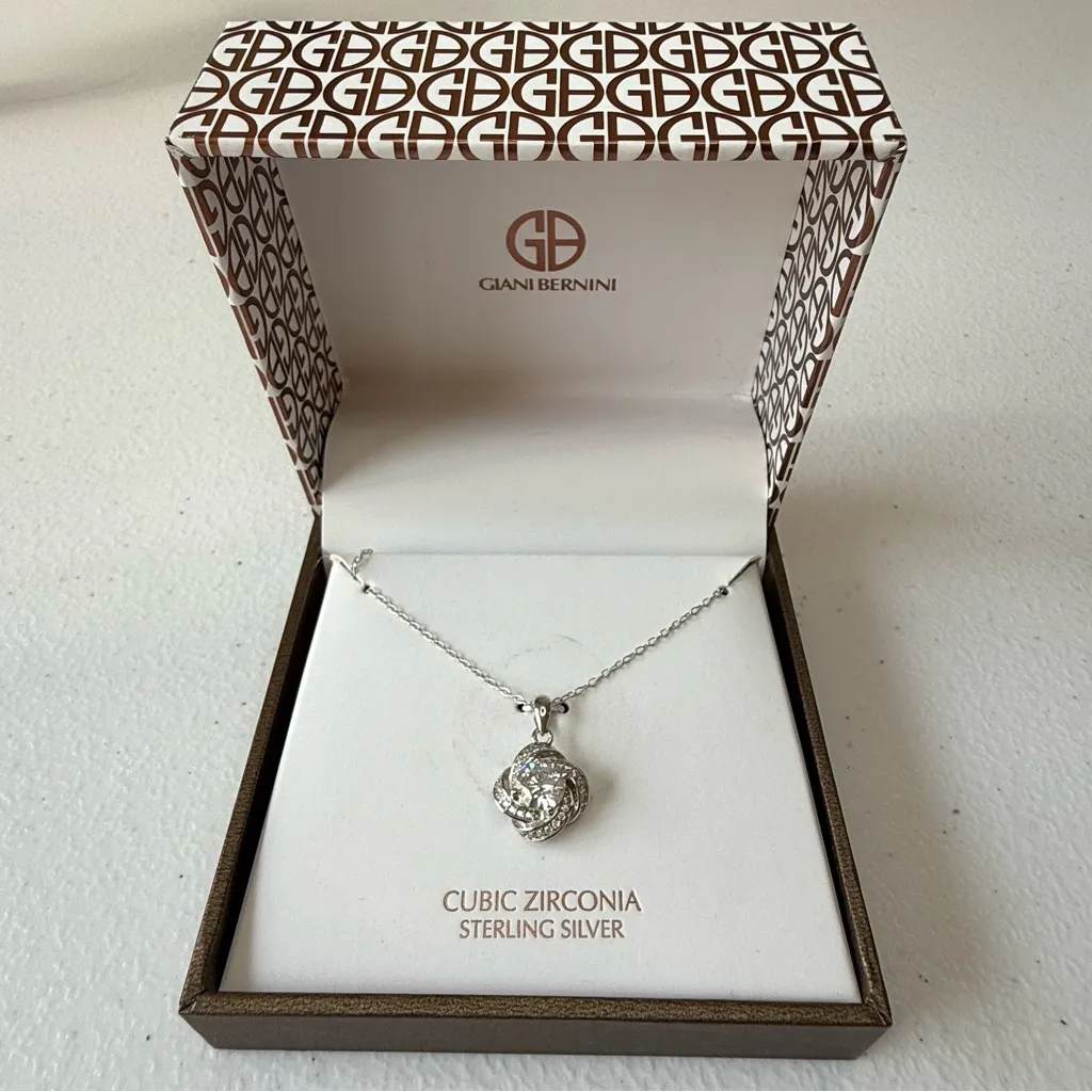 Stunning necklace by Giani Bernini. Features a brilliant cubic zirconia flower pendant. Crafted in sterling silver for timeless elegance. NWT but the box is damaged by stickers as shown in pictures.