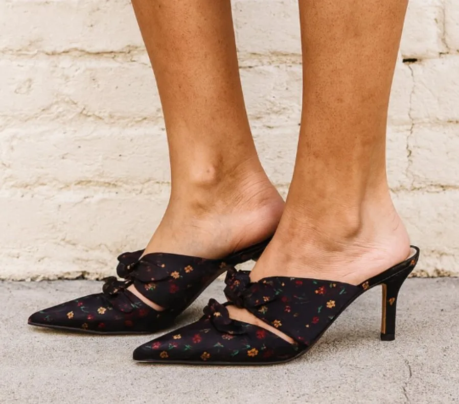 These are gently used Gianni Bini Black Floral Print Twist Knot Pointed Toe Mules Size 10. In very g... Show more