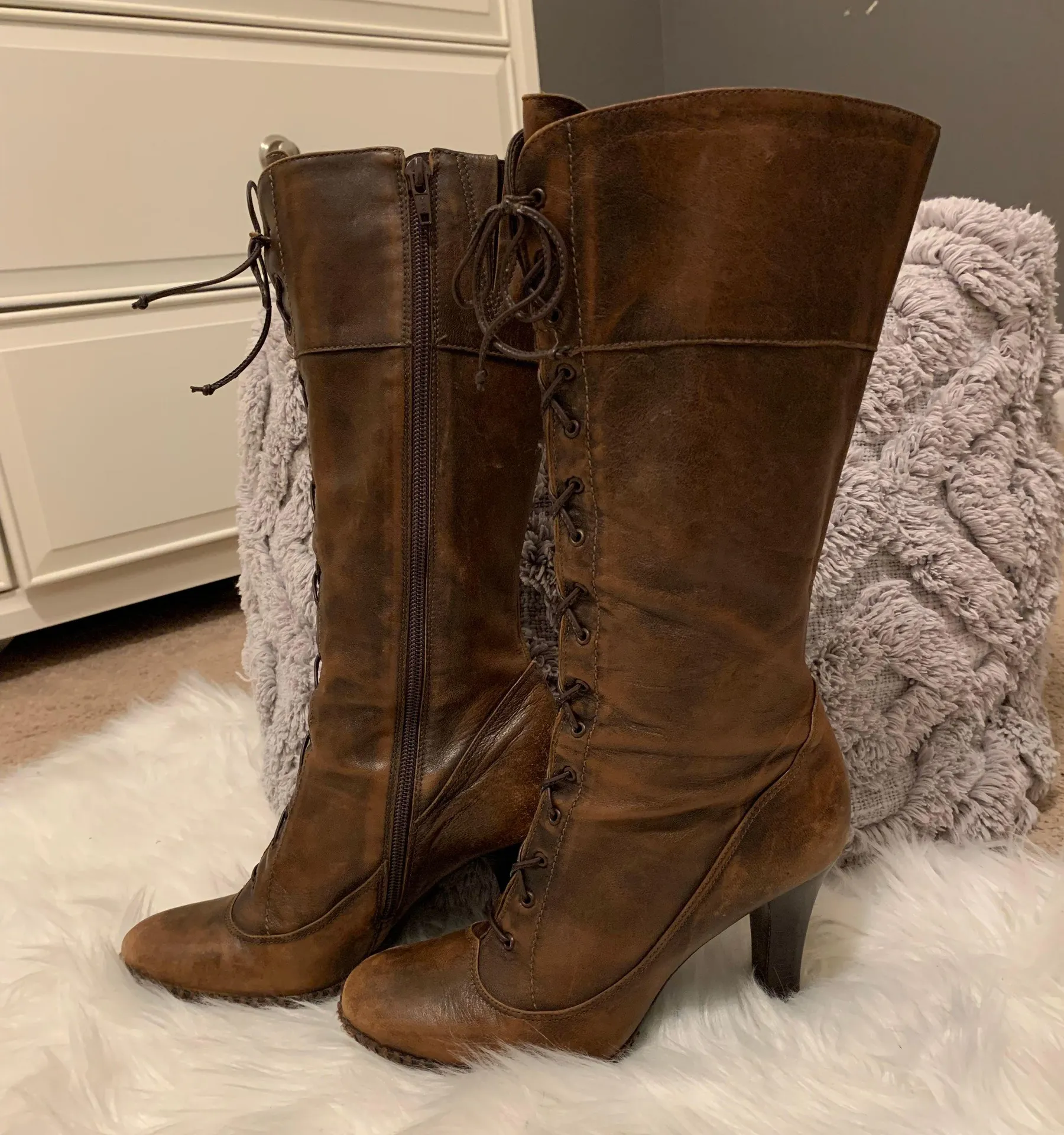 These leather boots have a lace-up design and a side zipper. See pictures - a few small scuff marks... Show more