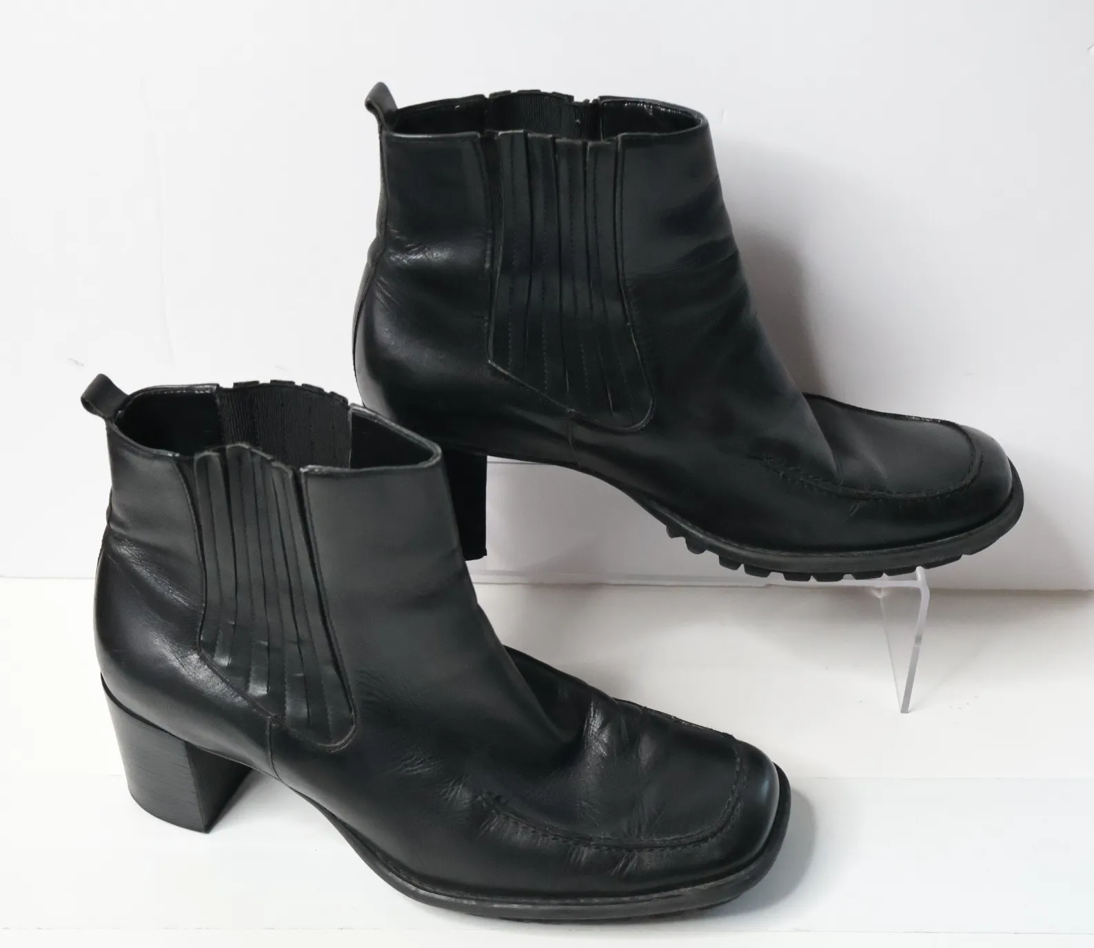 Keywords: black leather ankle boots, square toe boots, block heel booties, chelsea boots, womens boo... Show more
