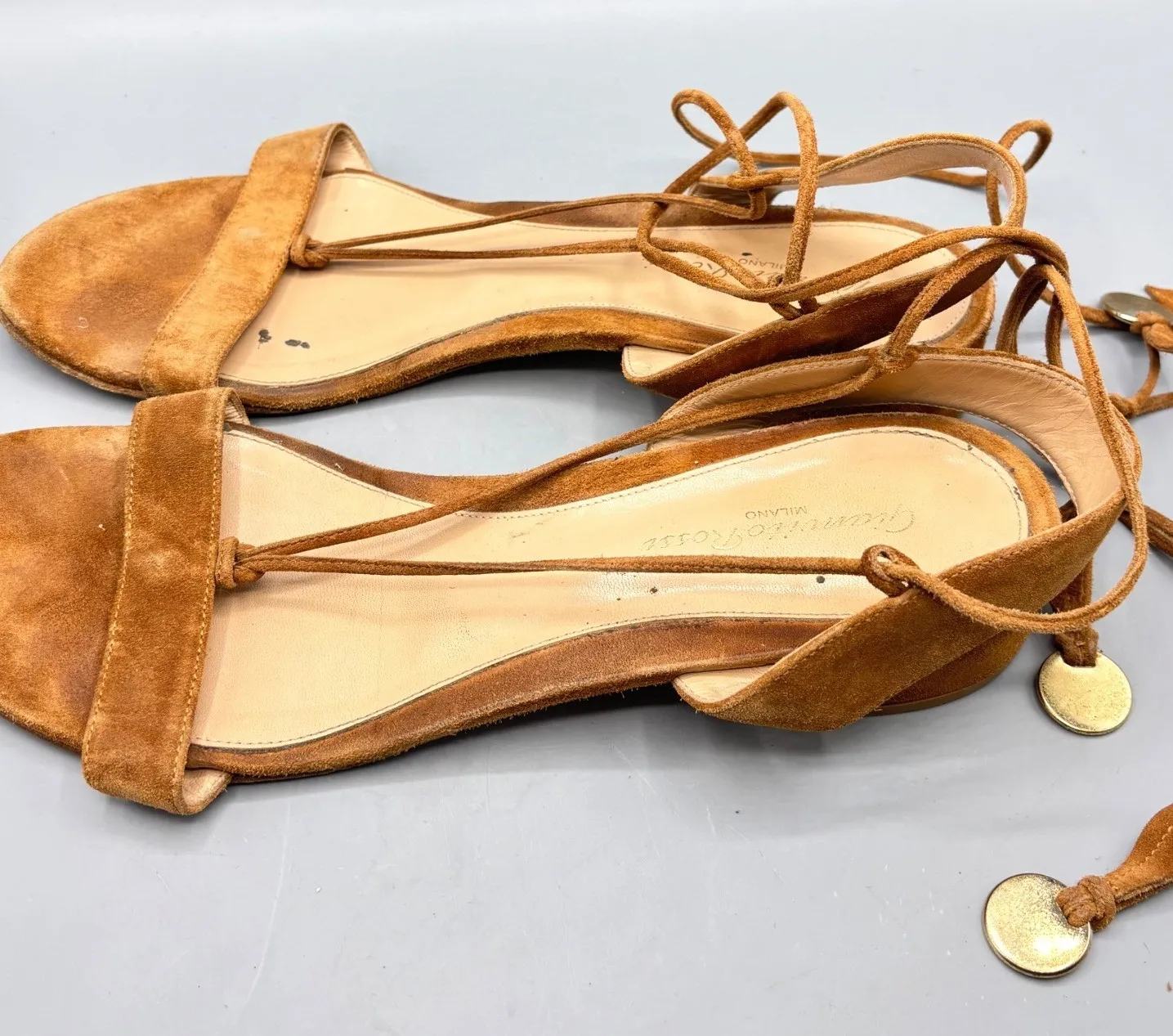 Gianvito Rossi tan brown suede lace-up flat sandals. These elegant sandals feature delicate straps that wrap around the ankle for a secure and stylish fit. Embellished with small gold-tone metal discs at the end of the laces. Size 38.5 Wear as can be seen in pictures.