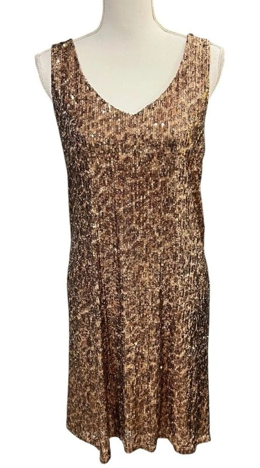 Size MEDIUM Excellent Preowned Condition : No holes, stains or tears See photos for measurements Pull on style Fully lined Sleeveless Style tags: holiday, festive, party, glam, New Years Eve, date night, special occasion, sequins, leopard print, cocktail, formal, gala, wedding guest, animal print