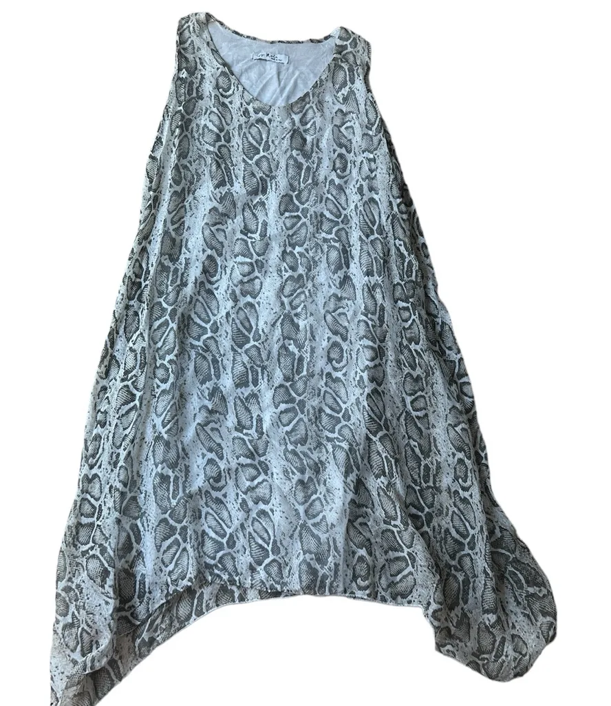 This stunning GiGi Moda dress features a beautiful snakeskin print. Made in Italy, the dress is crafted from a luxurious blend of silk and viscose, making it comfortable and breathable. Chest measures 20” lying flat. Length is about 33”