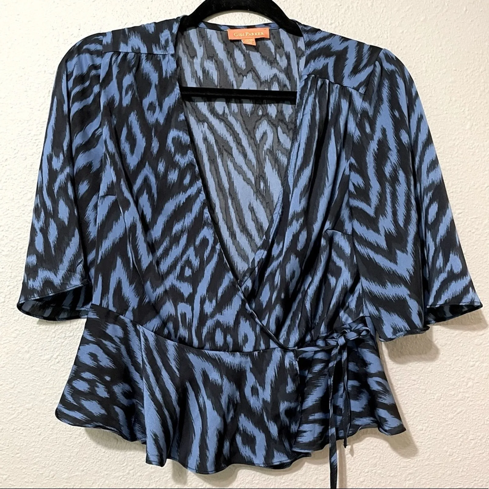 Gigi Parker Blue & Black Animal Print Flutter Sleeve Wrap Top Blouse Womens XS - $29 - From Lisa