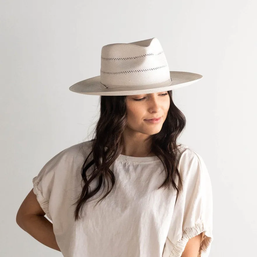 Gigi Pip Arlo Fedora Straw Hat Cream Wide Brim Hat Size 57cm (S/M) Very good condition- minor discoloration inside inner brim Meet the Arlo Straw Fedora—your warm-weather upgrade with a touch of sophistication. Featuring a classic teardrop crown and a stiff upturned brim, Arlo is crafted from finely woven straw with handwoven venting for a breezy, breathable feel and a textured, artisan look. It’s lightweight, structured, and ready for sunshine-filled days. Finished with a hand-sewn leather band, this fedora looks great on its own or layered with your favorite accessories to make it uniquely yours. From farmers markets to weekend getaways, the Arlo Fedora brings effortless style and all-day comfort. It’s the straw hat that goes with everything—and makes every outfit feel a little more polished.