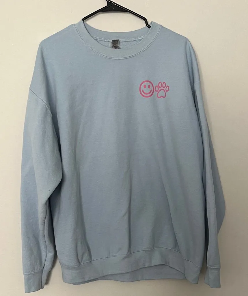Cozy light blue sweatshirt featuring a pink smiley face and paw print design. EUC Size XL