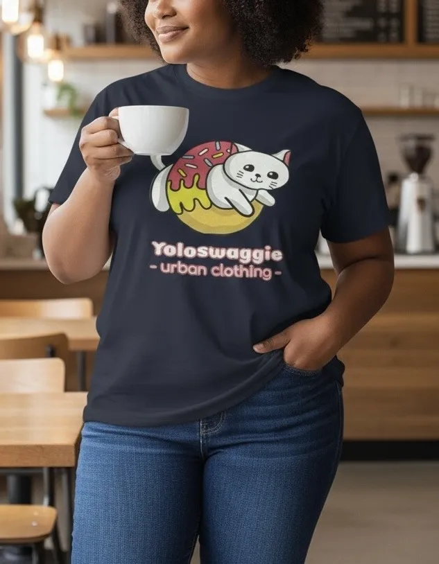 Super cute Yoloswaggie Urban Clothing graphic tee with a cat-in-donut design. • Gildan • Unisex 4XL... Show more