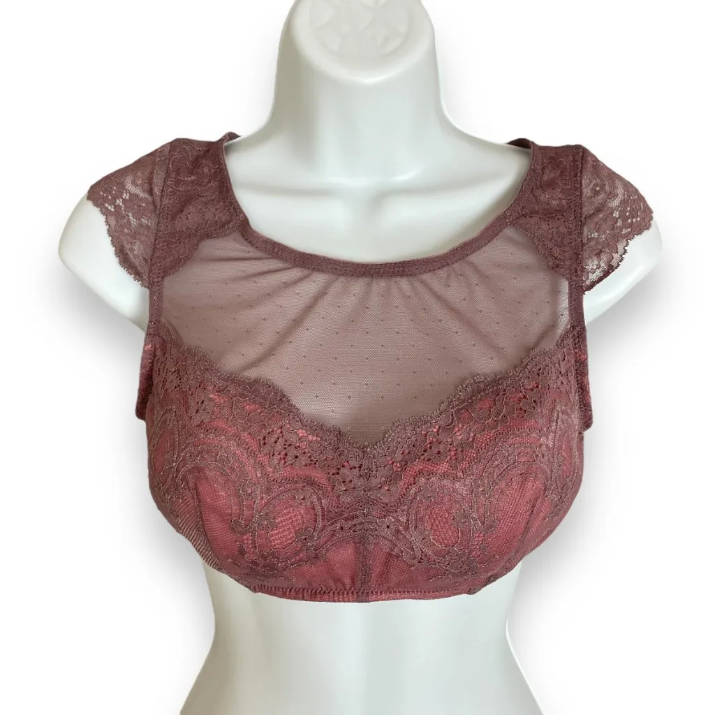 Gilligan & O'Malley lace cap sleeve bralette in purple and pinkish colors. Cut-out in back. Sheer ne... Show more