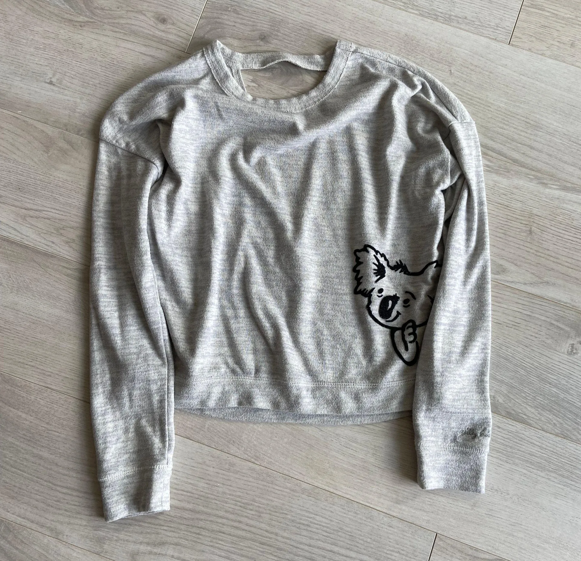 Really cute light grey sweater with a low v neck back and a koala in black on the side of the sweate... Show more
