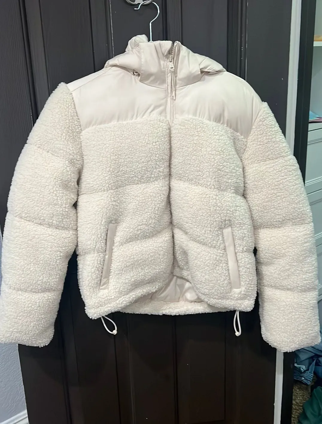 Cream white Sherpa puffer jacket with detachable hood and zippers on the pockets retail price was an... Show more