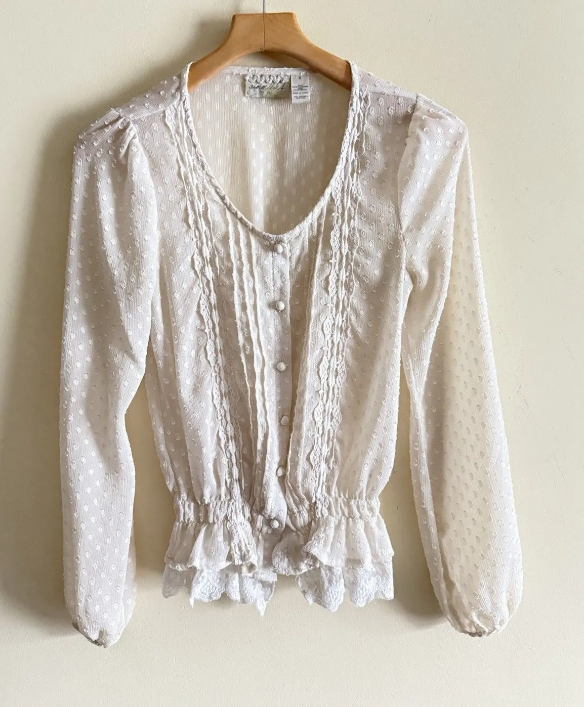 The Gimmicks by BKE Top Lace Crochet Button Romantic Cottage ivory Blouse in size Small is a stylish... Show more