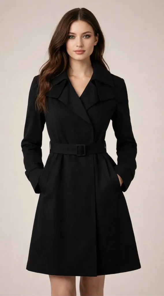 Preowned and in good condition! This elegant black wool trench coat is perfect for any occasion.Features a Waist Belt,Snap Closure,and Pockets.Its sleek design offers a timeless look that is both stylish and versatile. Fabric:Shell:100% Wool Lining:100% Acetate Measures:18” Underarm to Underarm and 29” Underarm to Bottom