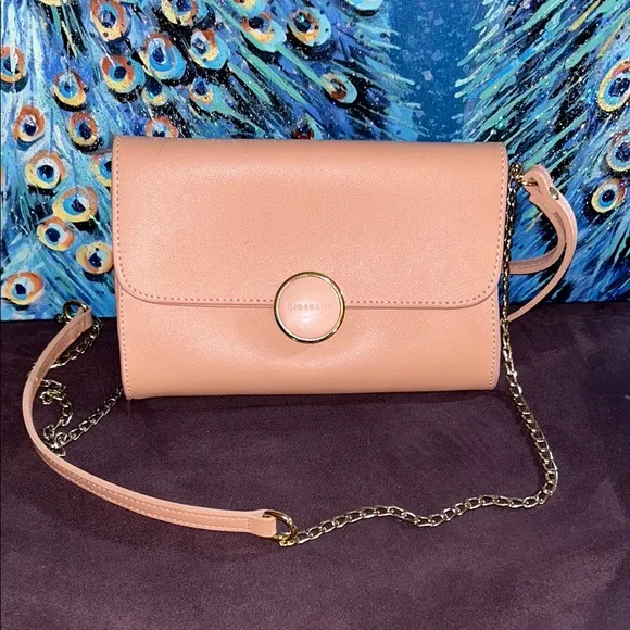 This sophisticated crossbody bag features a soft pink hue and a minimalist design, perfect for adding a touch of elegance to any outfit. The gold chain strap and circular metallic closure enhance its refined look, while the smooth leather-like material ensures durability and style. Ideal for carrying essentials, this medium-sized bag is both practical and chic. This bag is unused as shown metal still wrapped however there is color transfer to the back.