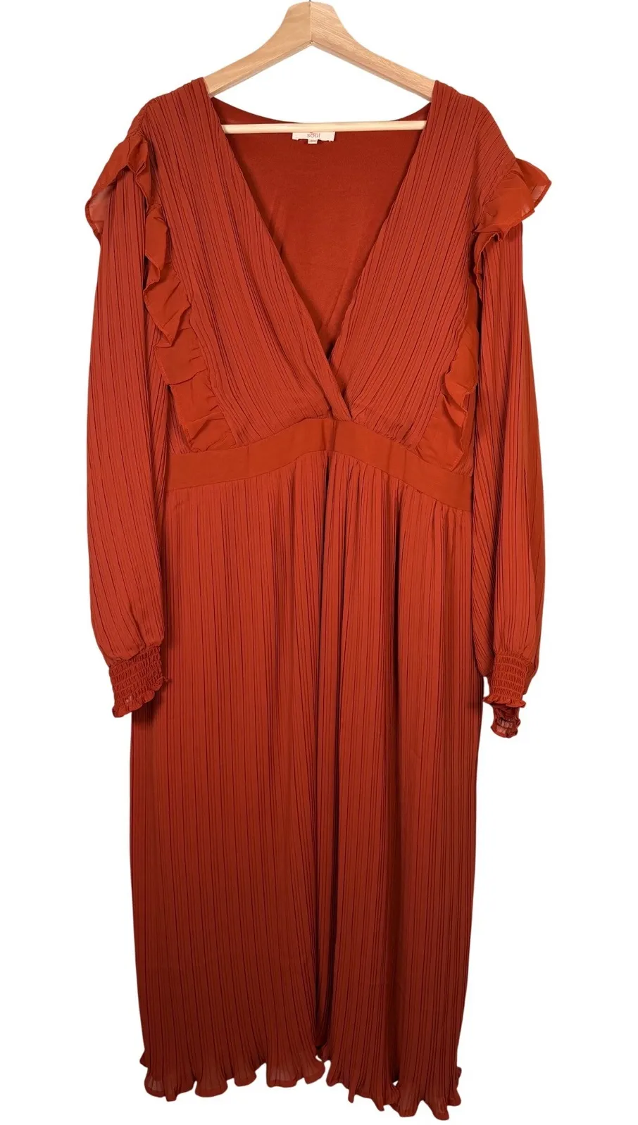 Girl Soul rust orange maxi dress with a flattering V-neck and long sleeves. Delicate ruffles adorn the shoulders and the plunging neckline, adding a touch of feminine charm. The entire dress is crafted with a beautiful pleated texture, and features smocked cuffs and a ruffled hemline. A defined waistband creates a graceful silhouette. Measurements: • Chest: 24 in • Waist: 19 in • Length: 55 in • Sleeve Length: 24 in Style: Maxi, A-Line Dress Length: Long Department: Women Sleeve Length: Long Sleeve Pattern: Striped Occasion: Casual, Party/Cocktail Material: Rayon Fabric Type: Rayon Theme: Peasant Neckline: V-Neck Season: Fall, Spring Sleeve Type: Balloon Sleeve Closure: Pullover Accents: Pleated, Ruffle Features: Stretch Keywords: rust dress, orange dress, pleated dress, ruffle dress, v neck dress, long sleeve dress, plus size dress, maxi dress, boho dress, feminine dress, smocked cuffs, fall dress, curvy fashion