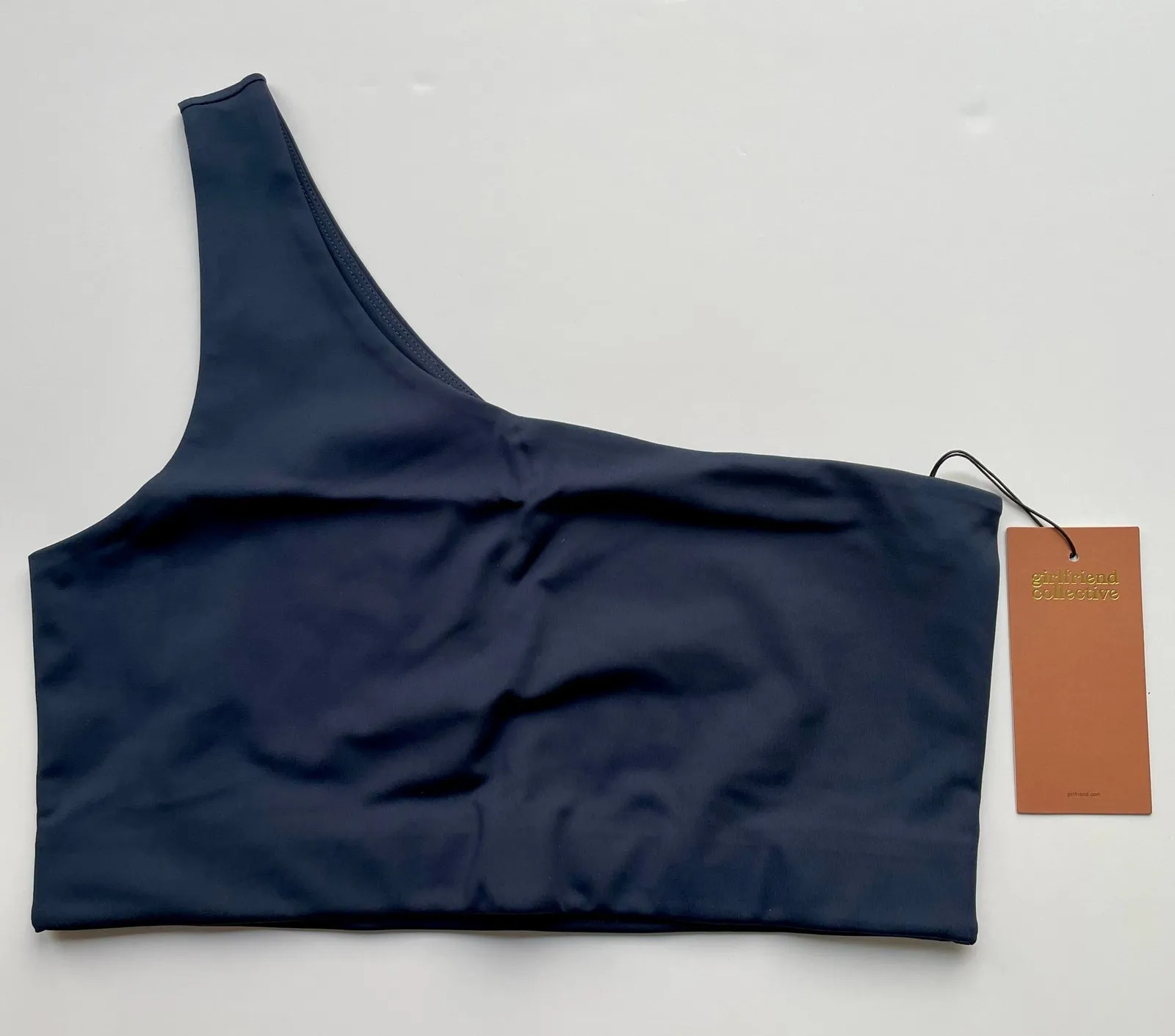 Navy blue sports bra from Girlfriend Collective Features one shoulder strap, built-in support band, and double lined, sweat-wicking material with four way stretch Condition is new with tags. Size XL Chest measures approximately 16 inches flat, unstretched Length is approximately 14 inches from shoulder to hem 79% recycled polyester, 21% spandex Tags: exercise, workout, fitness, gym