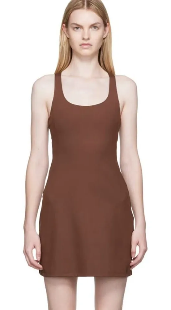 Girlfriend Collective Paloma Halter Dress – Brown, Women’s Size S Retails $120 Excellent condition! Measures: 30"L,13.5" armpit x armpit Stretch recycled polyester jersey dress. · Paneled construction · Scoop neck · Racer back · Mesh patch pockets at unitard underlay Supplier color: Earth 79% recycled polyester, 21% elastane. Girlfriend Collective, Paloma dress, halter dress, brown dress, women’s size S, recycled fabric dress, sustainable fashion, active dress, eco womenswear, built-in shorts dress