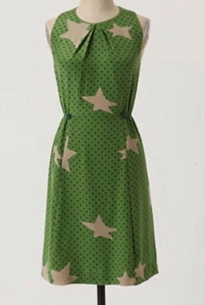 Girls From Savoy Anthropologie Size 4 women's US Green polka dot print dress with large star print Sleeveless; Crew neck Cute button detail at waist; Hidden zip Fully lined Shell: 100% silk/ Lining: 100% polyester Measurements taken across the front when laying flat: Bust: 18", Waist: 16", Length: 37" In excellent condition; no stains, holes or flaws I am always open to offers - bundle & save!